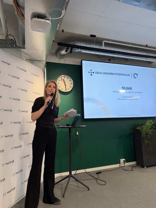 Catherine Bjerke, ansvarlig for internasjonalt arbeid i OUS, presenterte den nordiske universitetssykehusalliansen (NUHA), – et samarbeid mellom alle universitetssykehusene i de nordiske hovedstedene. Prosjektet viser hvordan land med like helsesystemer kan samarbeide om å utnytte data på en effektiv og ansvarlig måte.